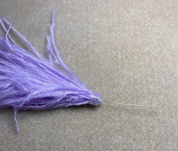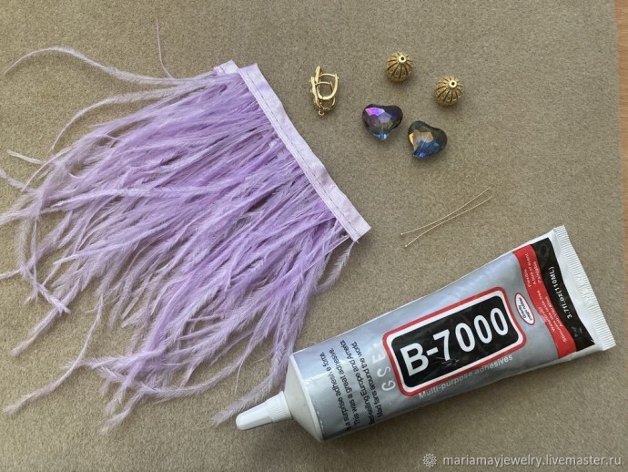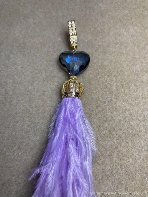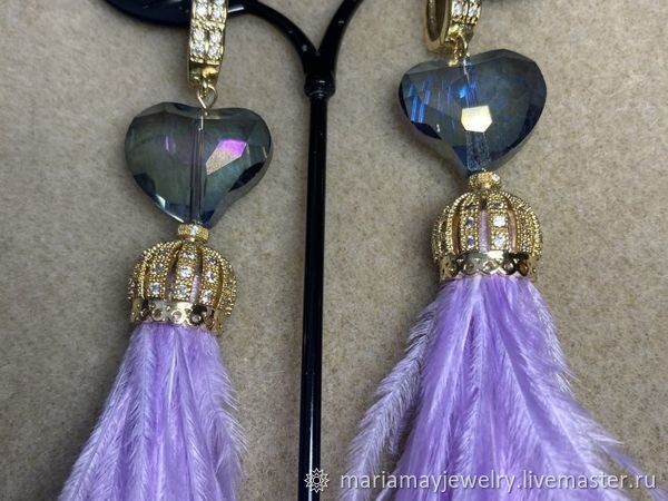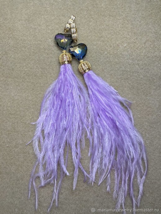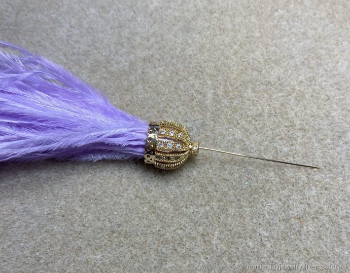 Материалы: перья страуса, пины с шариком, швензы с фианитами, концевик корона, гранёные бусины