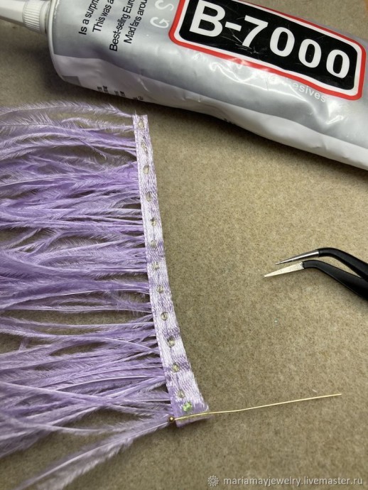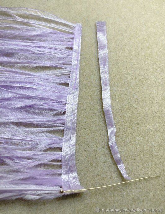 Отрежьте два кусочка перьевой тесьмы по 10 см. Желательно сразу выбирать участки с похожей длиной и равномерным распределением перьев, но если вы ограничены в запасах тесьмы, то всегда можно подкорректировать длину изделия в конце работы.