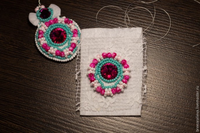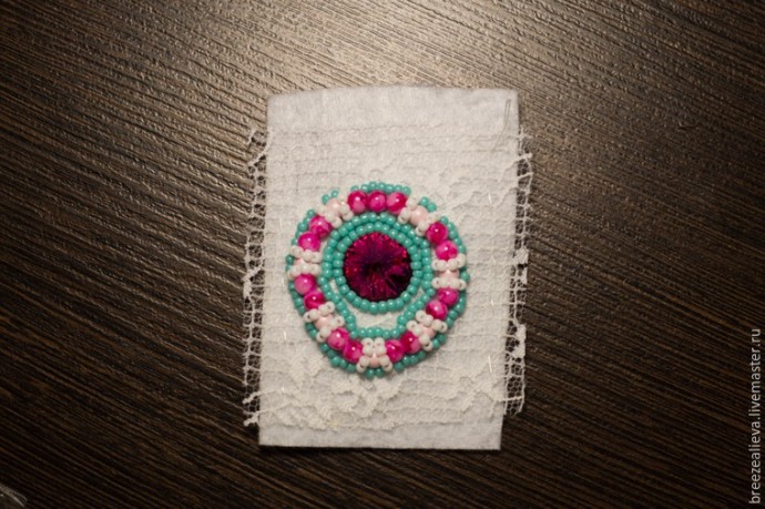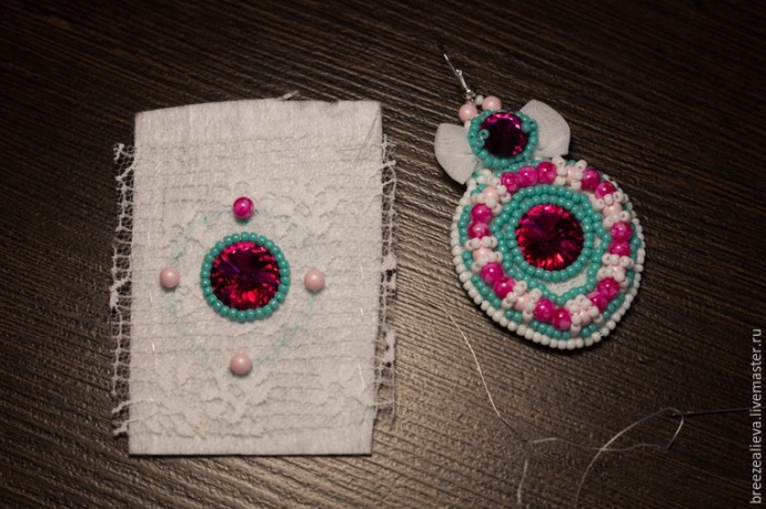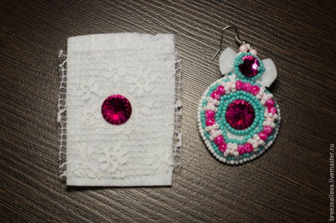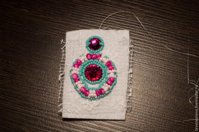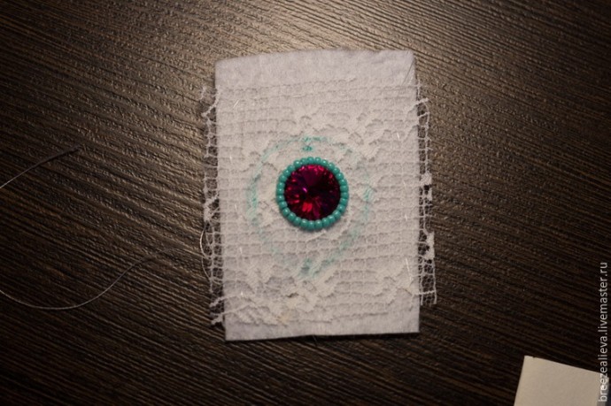 Обшиваем страз бисером и закрываем отверстия двумя бисеринами каждую.