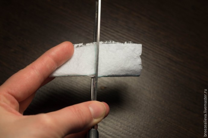 Из кусочка шифона формируем трубочку, края крепим огнем. Трубочку сгибаем пополам, так, чтобы шов оказался внутри. Примеряем, определяемся с длиной, обрезаем лишнее.