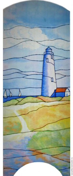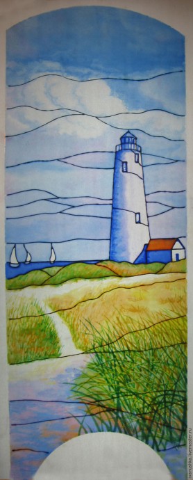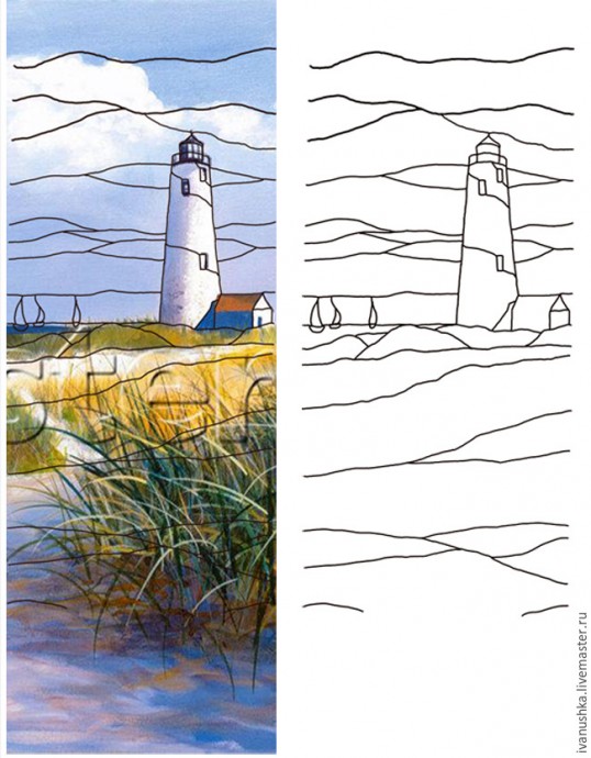 Стекло достаточно узкое, поэтому помещаю на эскиз всё, что нужно для пейзажа: море, пляж, маяк и парусные лодочки на горизонте. Вырезаю лекало стекла на бумаге. Для имитации витража с элементами росписи (знаю, звучит странно) разбиваю эскиз на воображаемые кусочки. Получила контур.