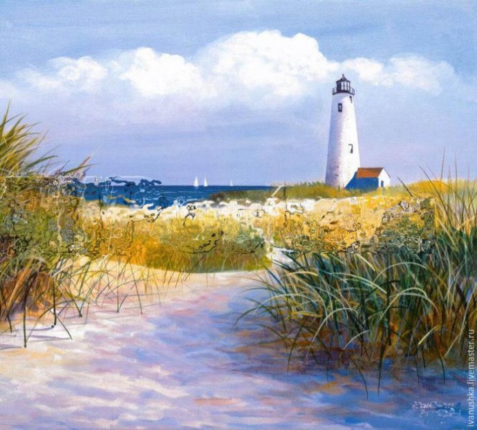Следующий шаг: воссоздаю картинку. Море, маяк и небо сделала сразу, в один слой, капая на свежую голубую заливку прозрачный лак, прямо носиком пипетки формируя облака. А вот траву и песок сделала в несколько заходов, наливая пипеткой тонкие травинки, давая каждому слою просохнуть. Так получила эффект густых зарослей.