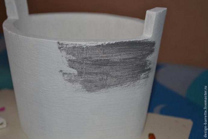 Здесь нужно вернуться чуть назад, в процесс грунтования. Я специально грунтовала поверхность широкой кистью с жесткой щетиной — таким образом у меня получилась чуть неровная поверхность с бороздками. И теперь мы используем это в процессе патинирования.