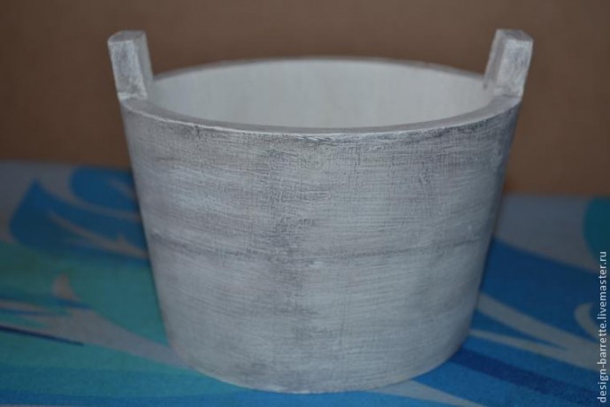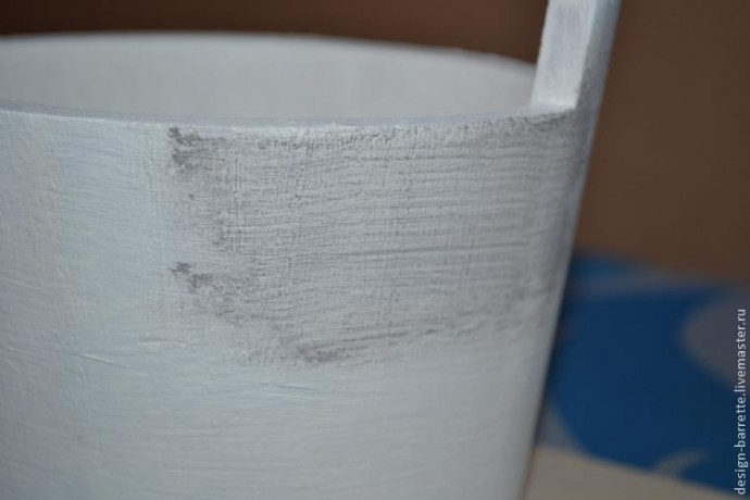 Далее покрываем изделие грунтом и даем просохнуть. После этого я крашу ее белой краской из баллончика. Даю просохнуть как минимум сутки — чтобы краска хорошо проникла в дерево. После этого немного шлифую наждачкой. Даже если где-то краски снимается слишком много — это даже хорошо для декора. После этого покрываю еще одним слоем краски из баллончика. На тумбочку у меня как раз ушел один баллончик. Корытце красила обычной акриловой белой краской с помощью кисти с жесткой щетиной — так получается немного полосатая структура и в последующем процессе это помогает в декоре.
