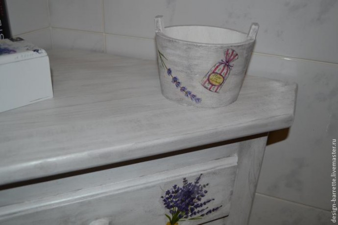 Итак, имеем небольшую деревянную тумбочку, которая ранее жила в бане, а теперь поселилась в светлой ванной. Задача стояла вписать ее в интерьер. Идея сделать мастер-класс появилась не сразу, поэтому фото не очень хорошего качества. Поэтому тумбочку я заменила на деревянное корытце. Собственно, оно было задекорировано тем же методом в пару к тумбочке.