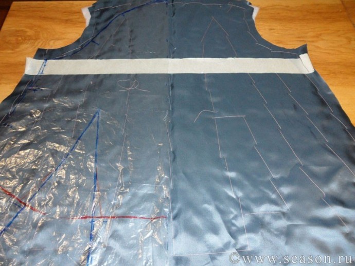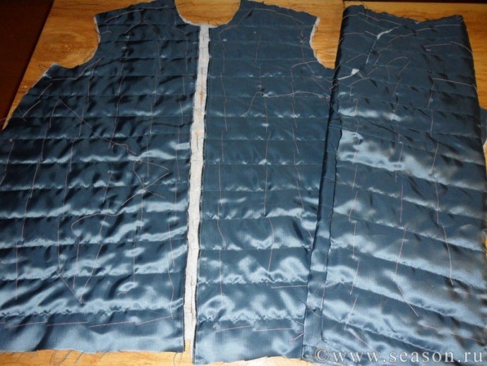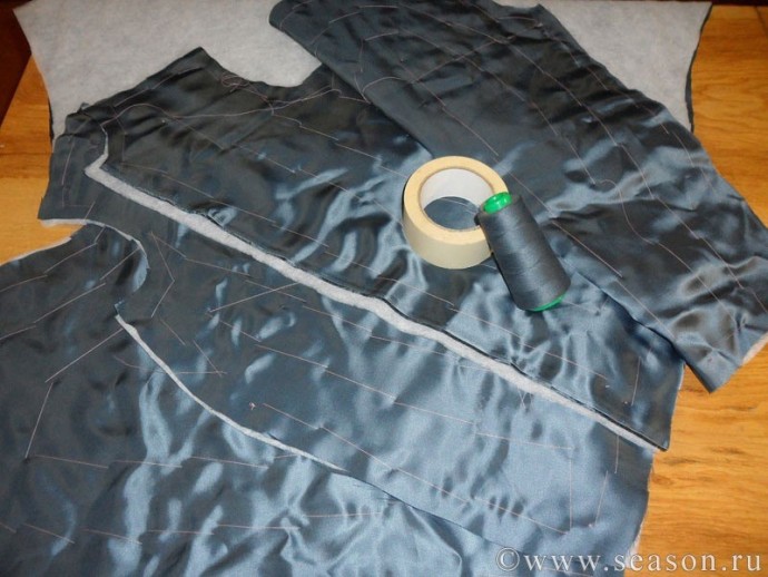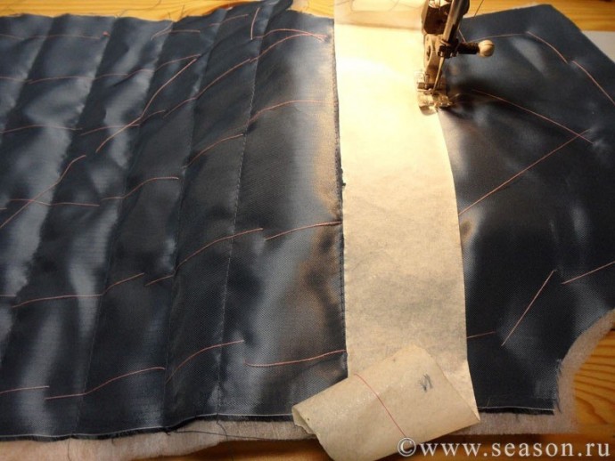 Накладываем ткань на утеплитель и скрепляем слои между собой намёточными косыми стежками. Интервал между стежками довольно большой. Раскладываем деталь на ровной поверхности и проводим первую линию стежки мелом. Приклеиваем скотч точно к линии и прострачиваем с двух сторон от полосы скотча. В нашем случае ширина скотча 5 см. Затем эту же полоску скотча приклеиваем к проложенной ранее строчке и строчим новую. И так, отклеивая и снова приклеивая скотч, стегаем всю деталь.