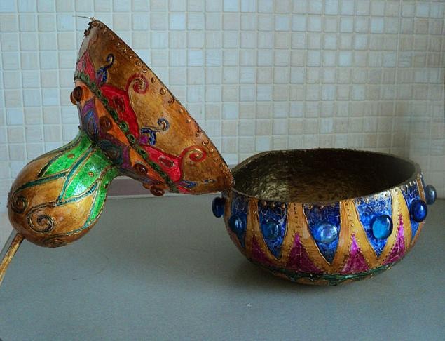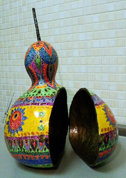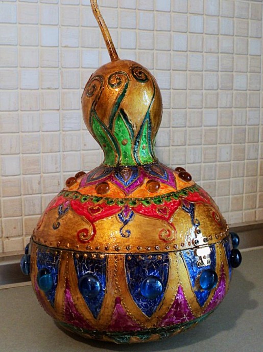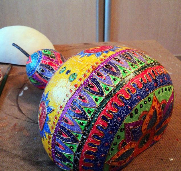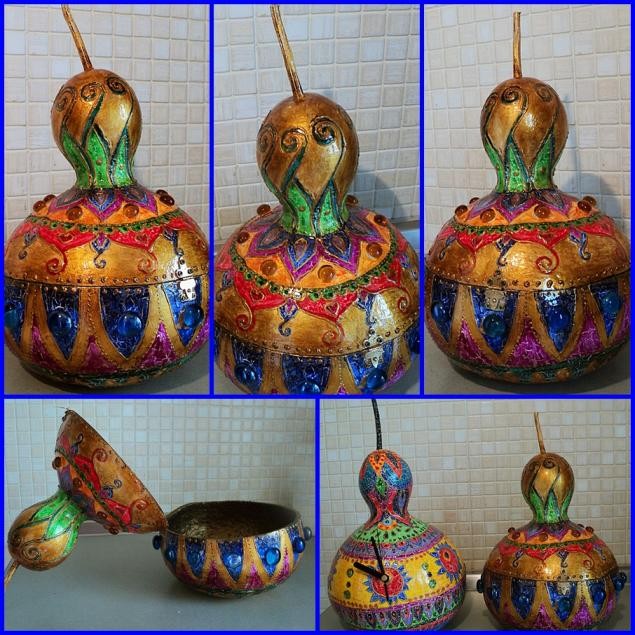 Материалы: тыква, акрил, кракелюрный лак, золотой контур, глянцевый акриловый лак, часовой механизм, стрелки