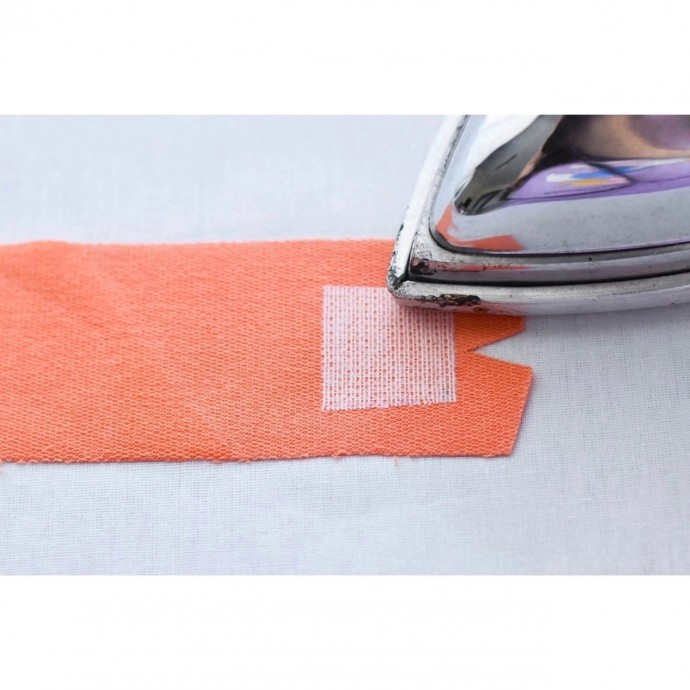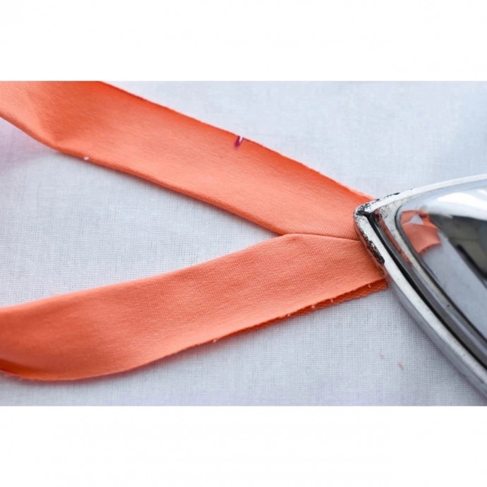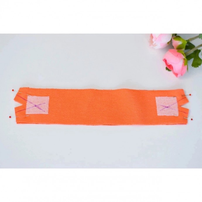 Наложите детали друг на друга изнанка к изнанке, совмещая короткие стороны и приутюжьте по всей длине, формируя сгибы по центру.