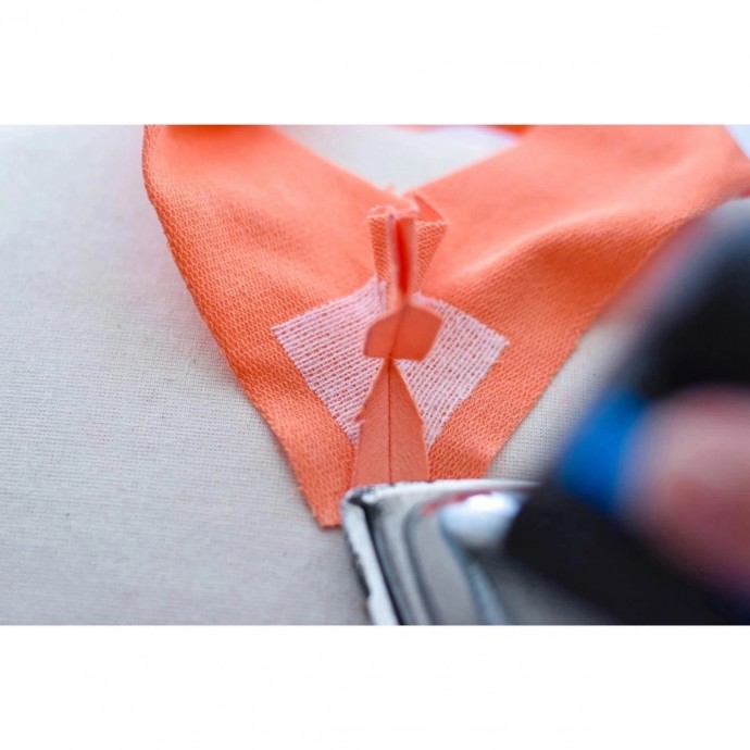 При помощи небольшого квадрата из дублерина (3/3 см) укрепите участки вдоль разреза на деталях кокеток (уголки).