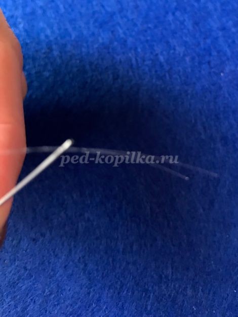 3. Отрезаем мононить длиной 1.5 метра, складываем её пополам, вставляем в иглу два хвостика нити. Закрепляем мононить на фетре. Делаем маленький стежок, вставляем иглу в петельку мононити, затягиваем.