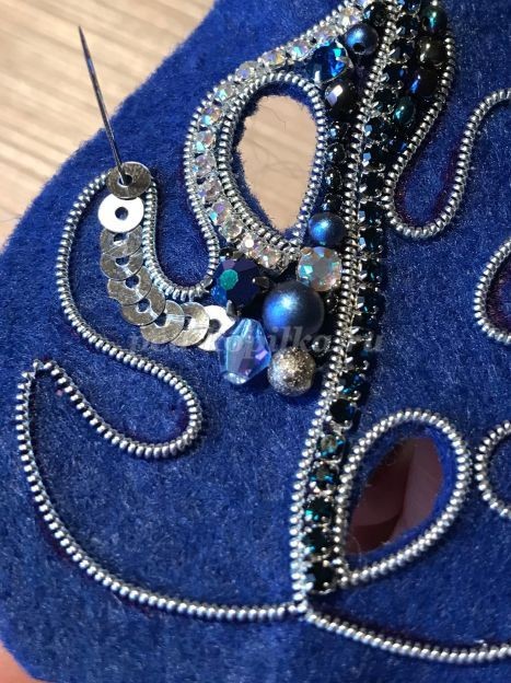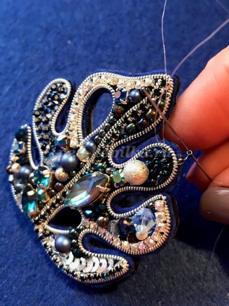 5. Начинаем заполнять левую внутреннюю часть броши, пришиваем стразовую тесьму. Мононить укладываем между страз. Пришиваем шатоны, лодочку,бусины, пайетки.