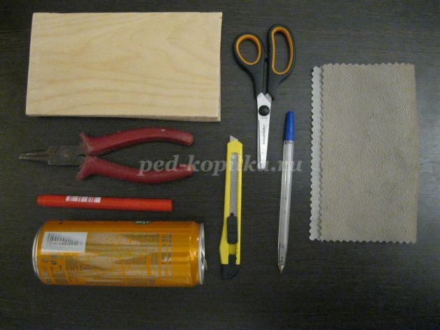 Нам потребуется: жестяная банка из-под газированного напитка, канцелярский нож, маркер или фломастер, линейка, ножницы, круглогубцы, мягкая ткань (небольшой кусок), шариковая ручка с пустым стержнем, фанера.