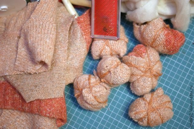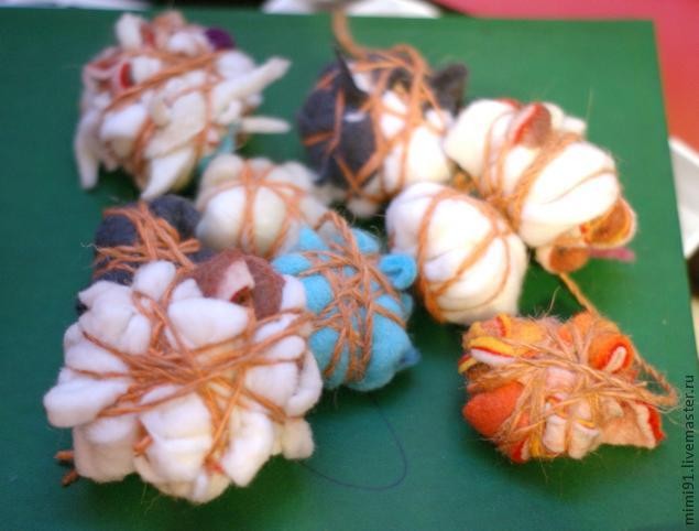 Я давно захомячила в хотелки МК Алисы Баженковой про валяные камушки и вот вчера сделала себе выходной от основных заказов и решила повалять. Заодно побороться с молью, которая начала жрать мои нескромные запасы шерсти, а для меня это как серпом по яй сердцу. Сваляла я по тому МК четыре камушка, употела вся, руки скукожились. И я подумала, надо как то упростить процесс до минимума и (моя жаба мне шептала - не трать хорошую шерсть во внутрь) сэкономить материалы и утилизировать что-то не очень нужное. Синтепон отпадает, он стоит не дешево. Попались на глаза давнишние обрезки от валяных сумок и жилеток. И еще старый свитер. Вот значится, свитер я почикала на кусочки. Обрезки войлочные смотала с помощью шерстяной нитки в подобие будущих камушков. В кусок свитера завернула кусочек сливера, плотно свернула и тоже обмотала нитками. Затем с помощью пуходерок начесала шерсть нужного цвета и обернула наши заготовки. Потыкала иглой. Достаточно закрепить шерсть на заготовке. Потом украсила прядками шелкового топса. Дальше все так же, засунула в капроновые колготки и отправила стираться в машинку на 47 минут, 60 градусов. В итоге что я получила - плотные камушки, руки не мочила, утилизировала старые свитера и обрезки войлока, особых трудов не прилагала. За вечер камней сваляла достаточно большую гору - коробку с верхом от обуви. Что еще можно завалять внутрь - старые шерстяные носки, шарфы, старое шерстяное одеяло (предварительно порезав на кусочки). А еще можно свои старые недовязы использовать, у меня их целая коробка и вряд ли я буду распускать или перевязывать. Вот так я поборола моль, жабу и хомяка