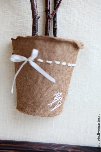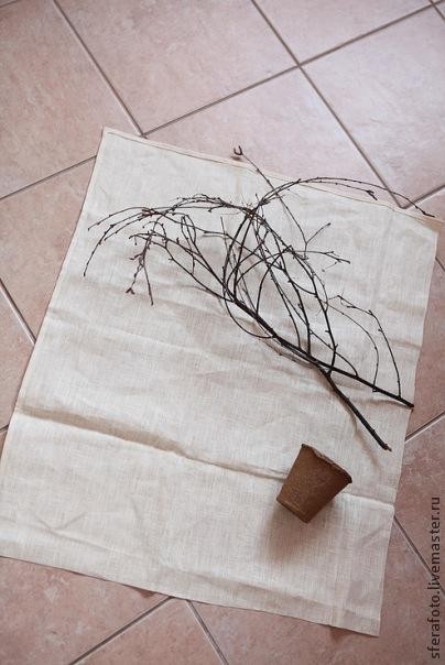 Берем кусок льна - 50х60 см, веточки берёзы и обычный торфяной горшочек.