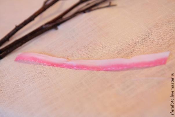 Делаем нежный розовый оттенок (я крашу ленты акриловой краской, размывая цвет с одного края до полупрозрачности)