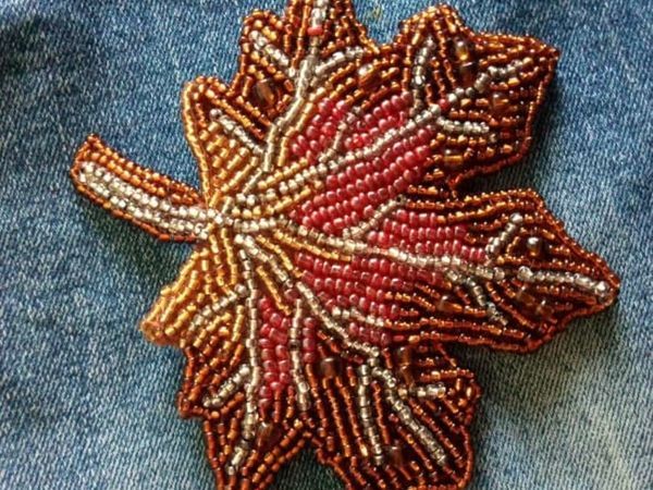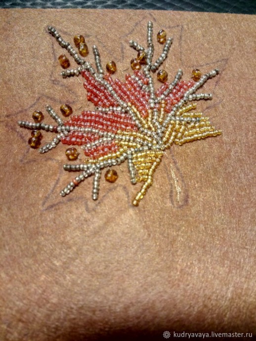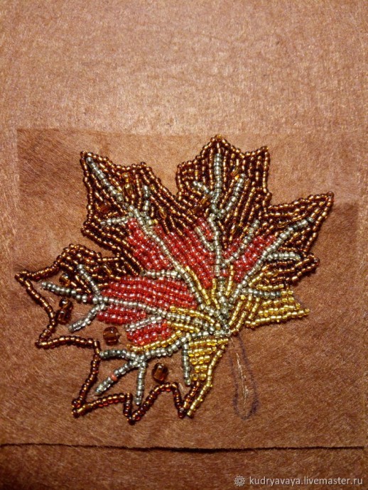 5. Начинаем с помощью шва «назад иголкой» заполнять (вышивать) элементы КЛЕНОВОГО ЛИСТКА. Например, сначала заполним прожилки листка прозрачным бесцветным бисером. Нанизываем на иголку по две бисеринки и продвигаемся по прожилкам. Затем начинаем заполнение по цветам: жёлтый, коричневый, красный. Аналогично пришиваем крупные коричневые бусины как в цвет основного коричневого цвета на концах листка.