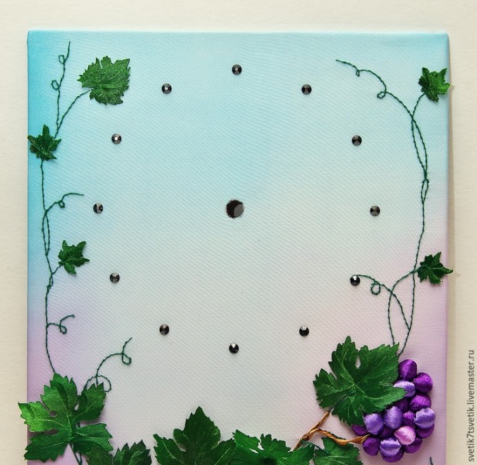 После того, как работа зафиксирована на картоне, прорезаем отверстие для часового механизма и наклеиваем стразы по размеру стрелок.