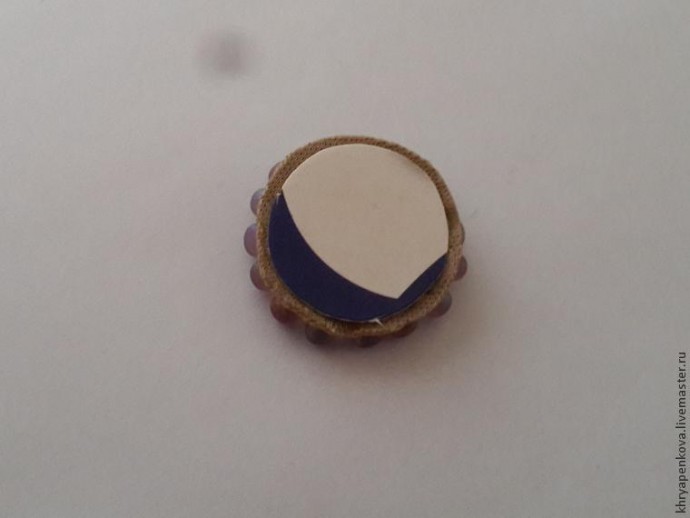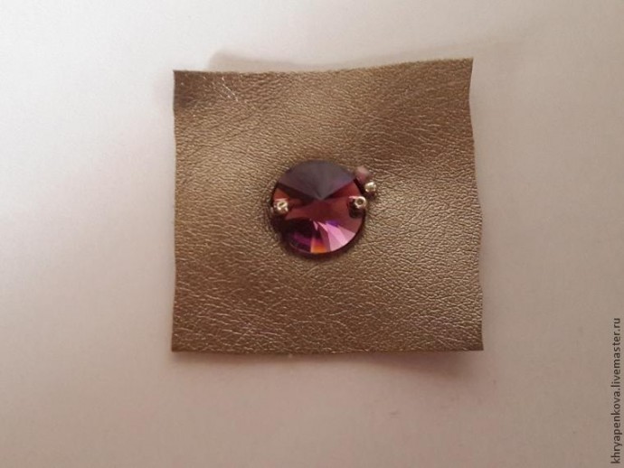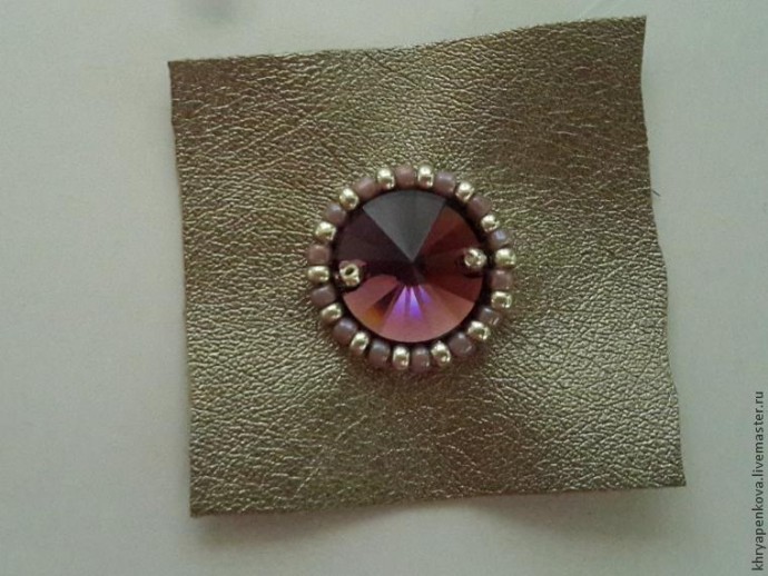 Приклеиваем кристалл к ткани. Затем пришиваем двумя серебристыми бисеринками №15.