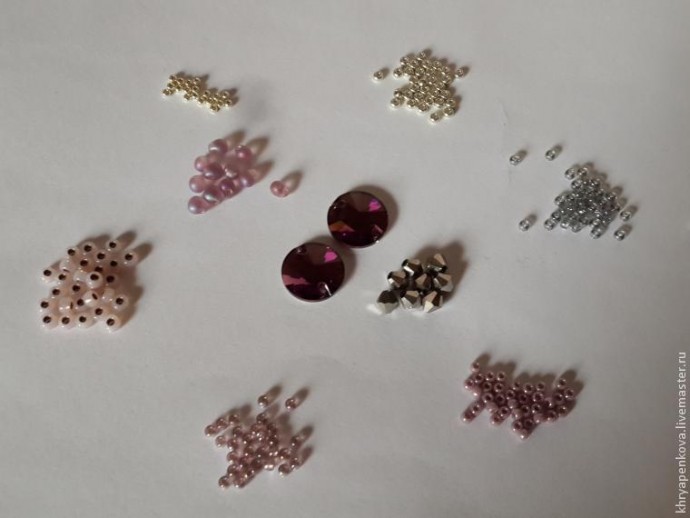 Выводим иглу в металлик, соединяем его со следующим 3 бусинами: розовый прозрачный №11 — розовый №8 — розовый прозрачный №11.