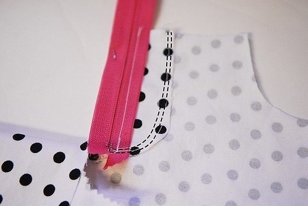 Теперь к краю сгиба пришиваем молнию с одной стороны и делаем острочку по нарисованной линии.