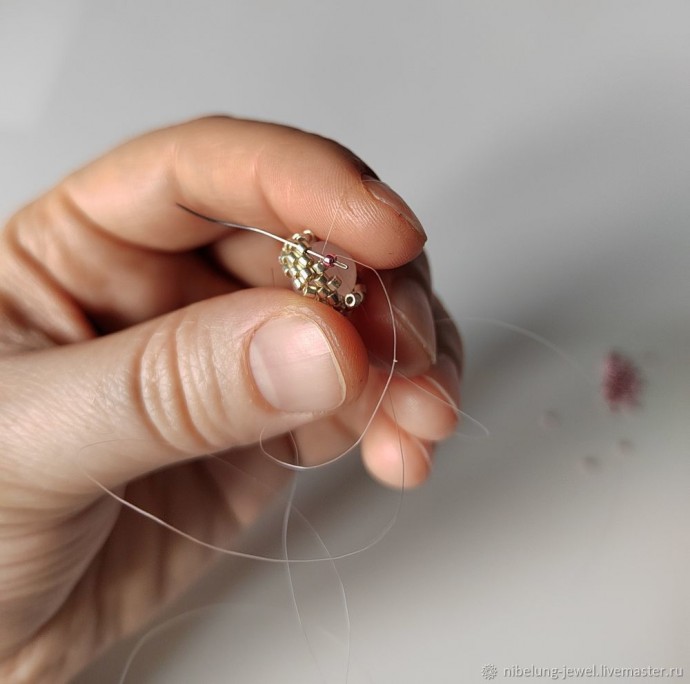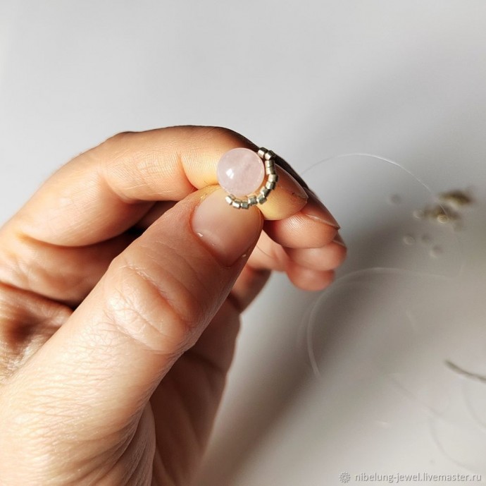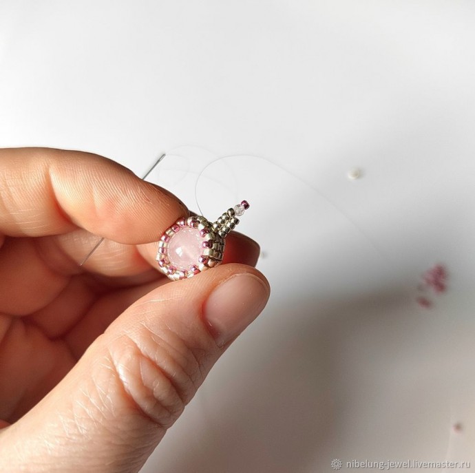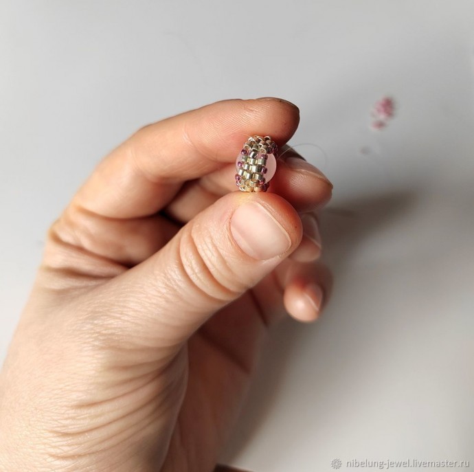 Переходим на другую сторону пояска вокруг бусины и проделываем то же самое - приплетаем ряд 15/0 розового металлика и стягиваем этот ряд, повторно пройдя нитью через все бусины.