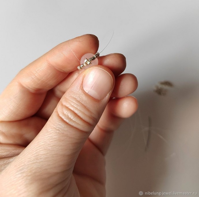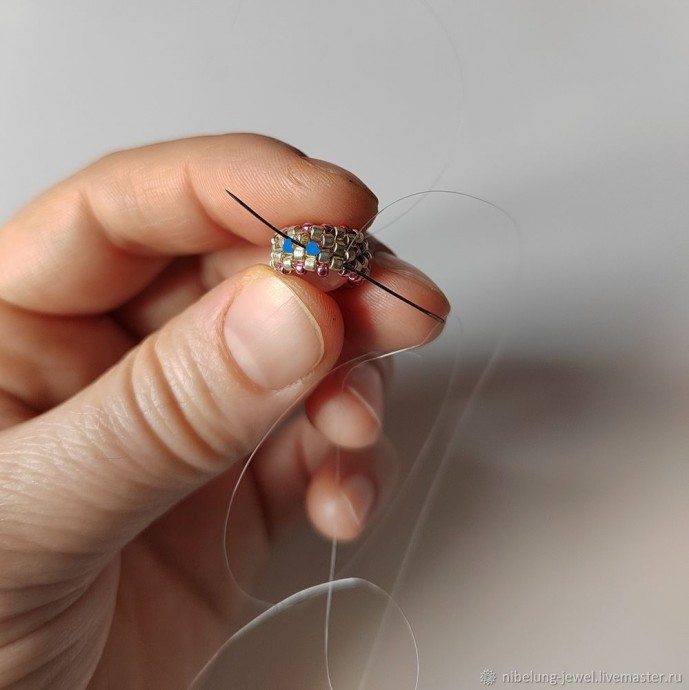 Еще раз проходим мононитью через только что набранный ряд delica так, чтобы оба кончика нити оказались рядом. Завяжите несколько узелков, чтобы ничего не ездило и выведите иглу в следующую бисерину.