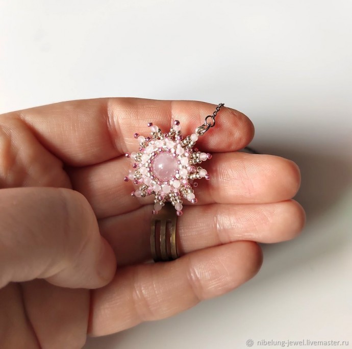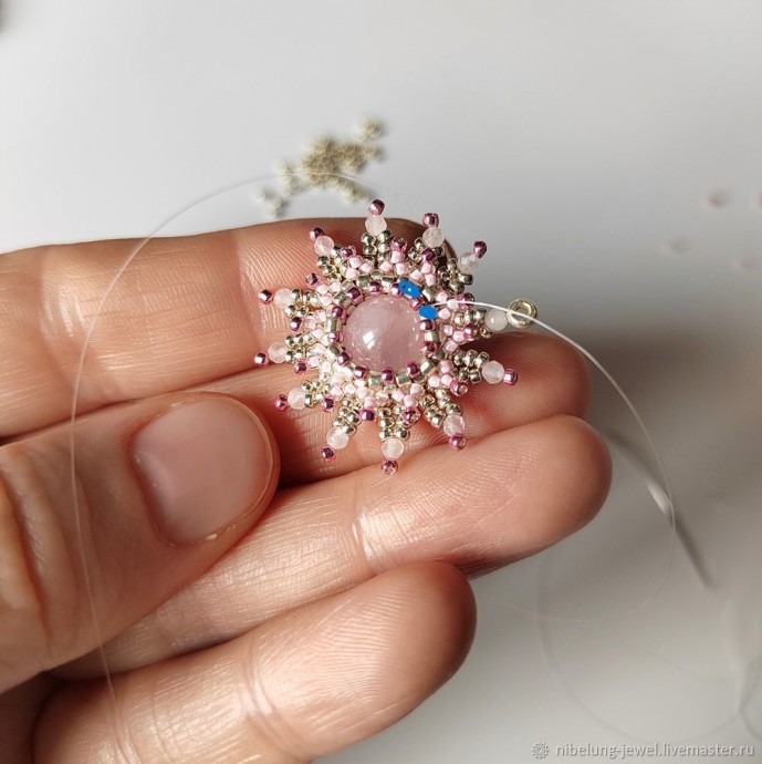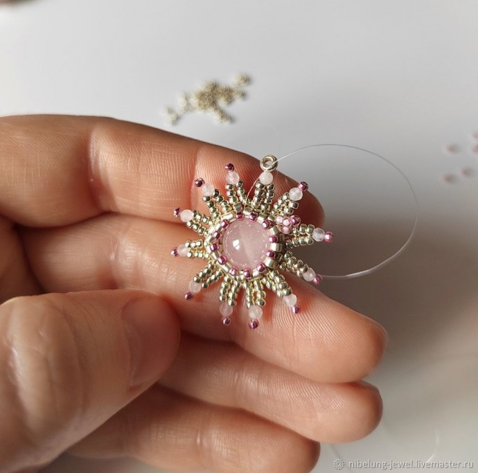 В длину каждый лепесток центрального ряда составляет 4 серебряных 15/0 бисерин, бусину розового кварца 2 мм и бисерину 15/0 розового металлика.