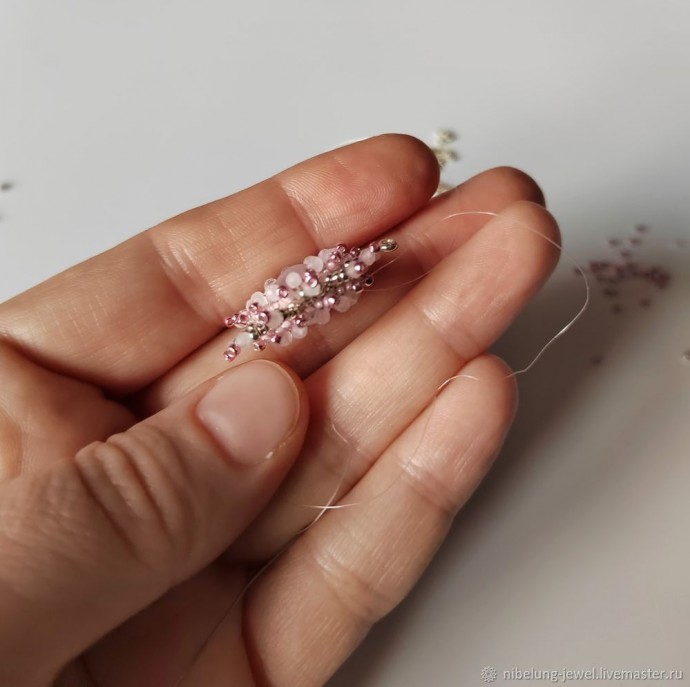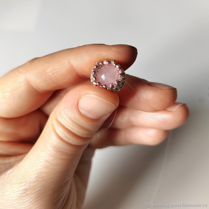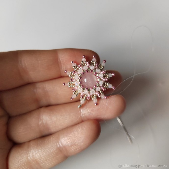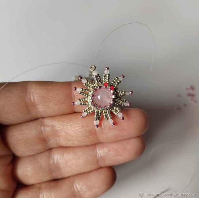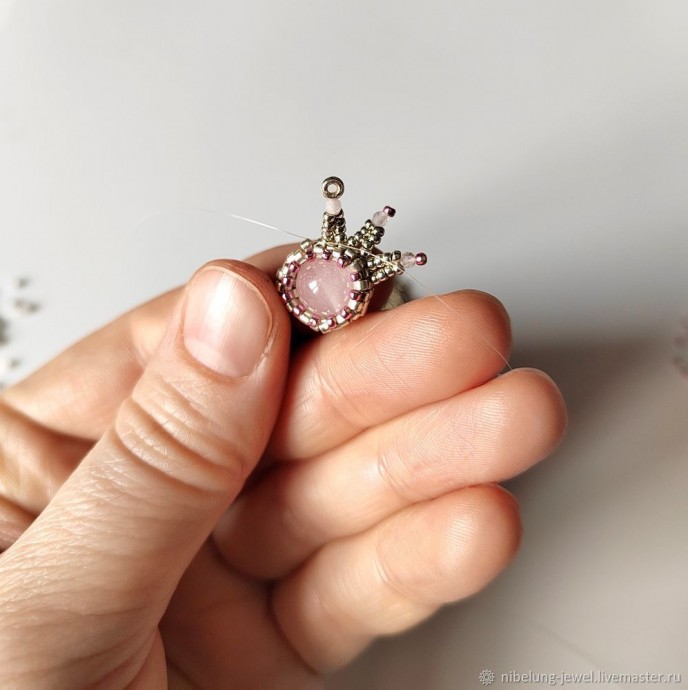Завершив последний ряд на одной стороне, переходим нитью через бисерины delica на бругую сторону и там повторяем эти два ряда - короткие розовые лепестки и розовый кварц. Должна получиться симметричная конструкция. Таким образом, у нашей будущей серьги не будет изнаночной стороны