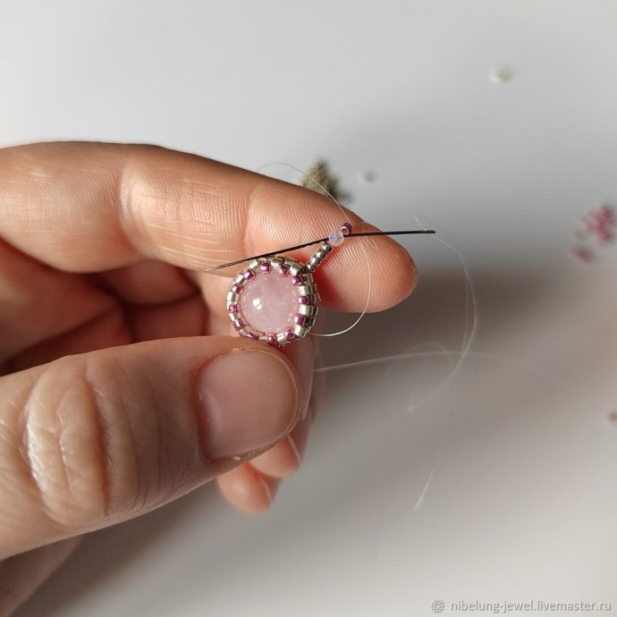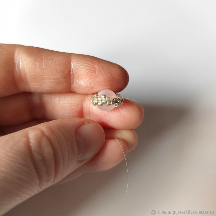 Плетем таким образом весь ряд. Завершив его, переходим на ряд выше (дальше от центра широкого пояска delica и ближе к краю) и приплетаем ряд бусин розового кварца 2 мм.