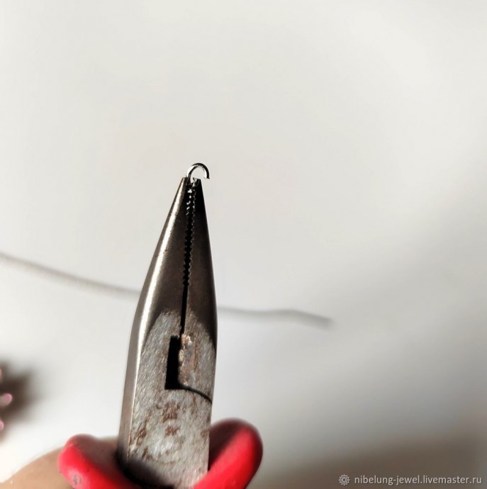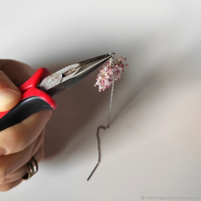 С помощью плоскогубцев и кольца-упора раскрываем соединительное колечко, нанизываем на него наш цветок (через спецлепесток) и основу для серьги протяжки и плотно закрываем колечко.