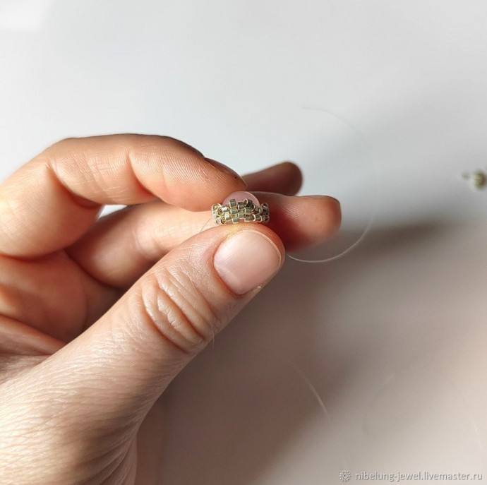 Должен получиться поясок вокруг бусины из 3 и 2 бисерин в чередующихся столбиках.