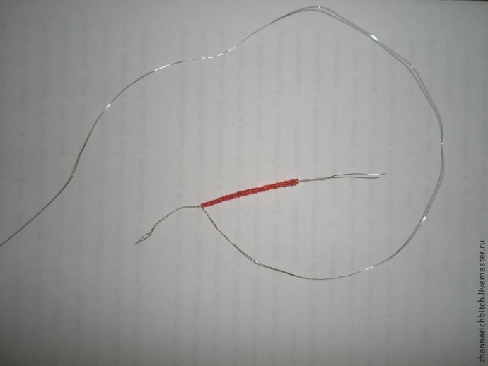 Вдеваем в иголку для бисера, набираем три бисерины. Пропускаем ближайшую к иголке бисерину, и вдеваем в иголку две оставшиеся бисерины.