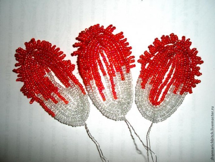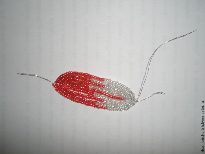 Для второго ряда на один конец проволоки нанизываем две бисерины, свободный конец проволоки продеваем через эти две бисерины и осторожно затягиваем. Далее так делаем 3 ряда по 3 бисерины, еще два ряда по 2 бисерины, последний ряд из одной бисерины, оставшиеся концы проволоки перекручиваем.