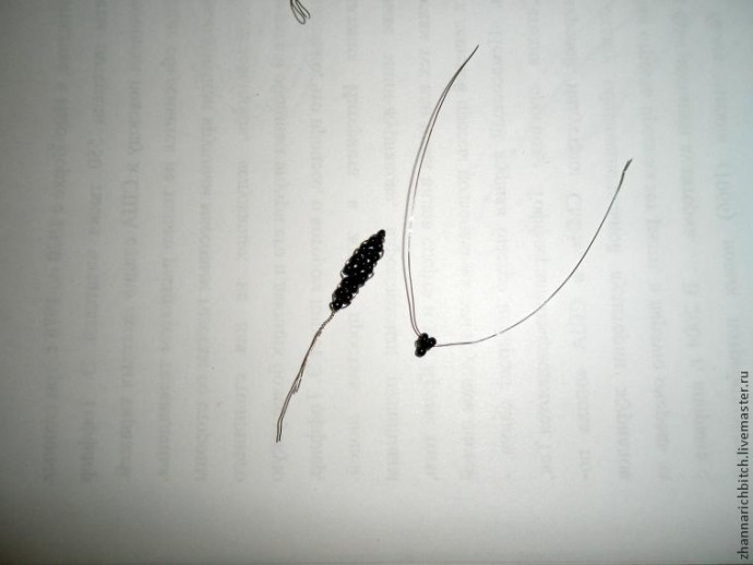 Тычинки. Я выбрала также один из известных всем вариантов. Берем проволоку длиной 8-10 см. Нанизываем бисерину черного цвета, размещаем ее в середине проволоки. Это будет первый ряд.