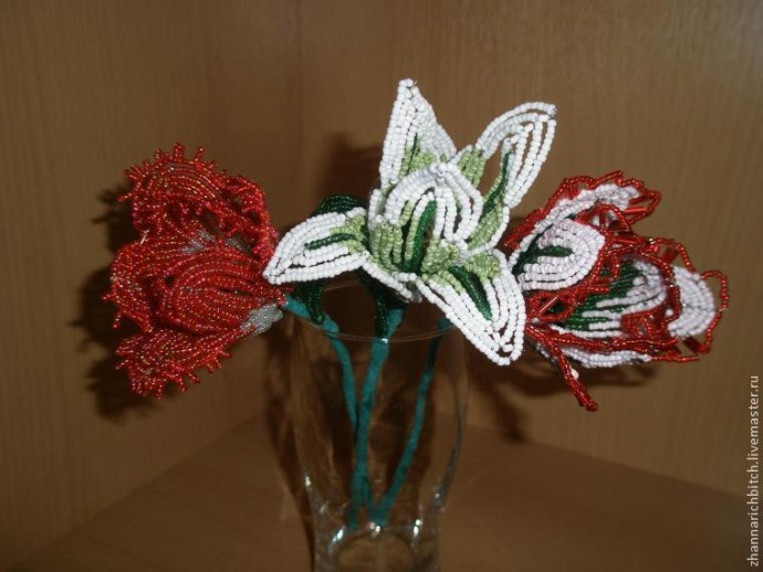 На скрученный конец проволоки нанизываем 3-5 бисерин, продеваем толстую проволоку, которая будет служить стеблем тюльпана. Вот для этого потребовался бисер с большим отверстием.