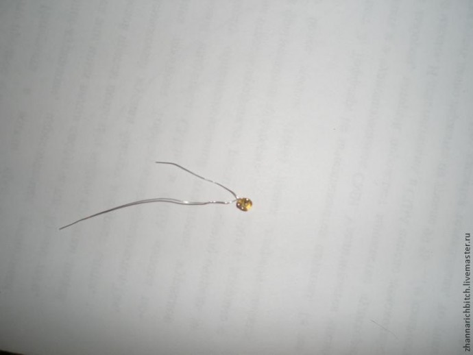 Нанизываем следующу бисерину рядом с первой, перекручиваем, нанизываем третью бисерину рядом со второй, перекручиваем. На проволоке три близко расположенные друг к другу бисерины. Скручиваем их друг с другом.
