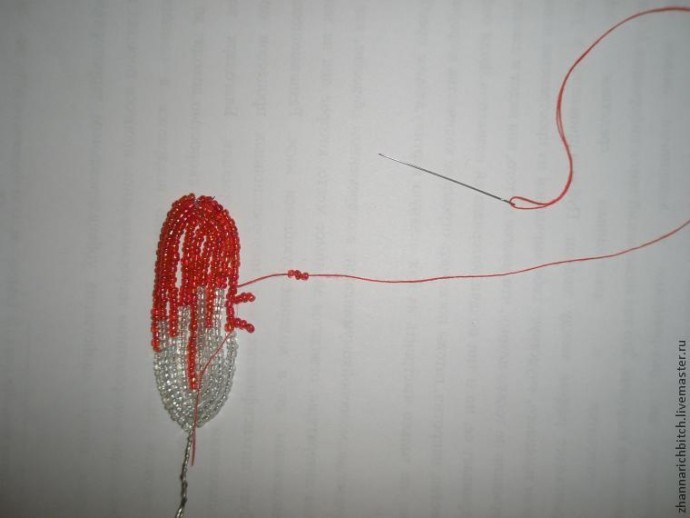 Закрепляем "висюльку" в последнем бисерном ряду лепестка, затянув узелок на проволоке между бисеринами. Продеваем иголку через 2-3 бисерины последнего бисерного ряда лепестка и вновь делаем "висюльку", набирая на иголку 3 бисеринки.