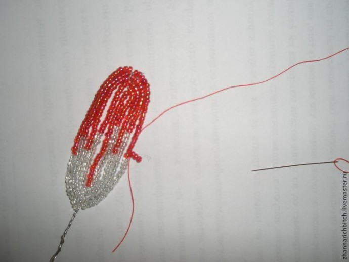 Для этого катушечную нить привязываем к последнему бисерному ряду примерно в середине боковой части лепестка.