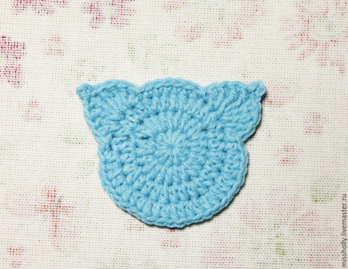 4. (ПСН, пр) – 8 раз, сс; первое ушко - 2 ССН в одну петлю; в сл. петлю: *2С2Н, пико, 2С2Н*; 2 ССН в одну петлю, сс; макушка - 6 СБН, сс; второе ушко – 2 ССН в одну петлю; в сл. петлю: *2С2Н, пико, 2С2Н*; 2 ССН в одну петлю, 2 сс. Нить отрезать, оставляя небольшой кончик. С помощью иглы с широким ушком, спрятать нить в изделие.