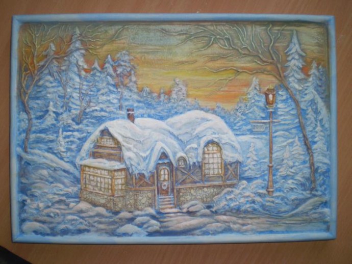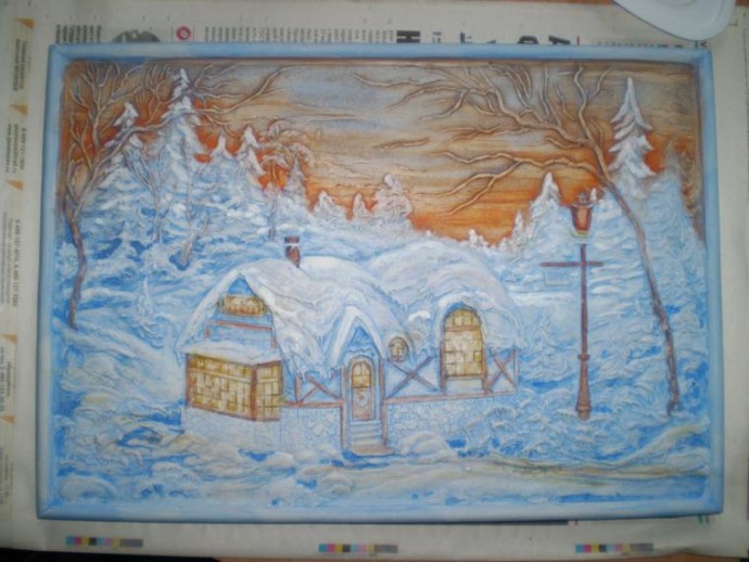 Добавляем, где нужно потемнее или посветлее. Растушёвываем всегда базовой краской, но аккуратно, иначе краска, смешиваясь, будет грязнить. Передний план должен быть прорисован лучше, контрастнее, задний — более сглаженный. Если не очень нравится, попробуйте один приём, который подходит только для объёмного изображения. Дайте слегка подсохнуть картинке и пройдитесь по ней сухой жёсткой кисточкой или сухим тряпочным тампоном. Сразу проявится рельеф.