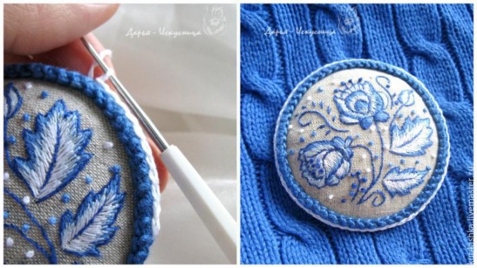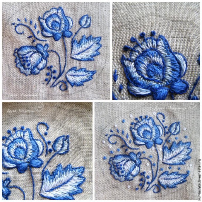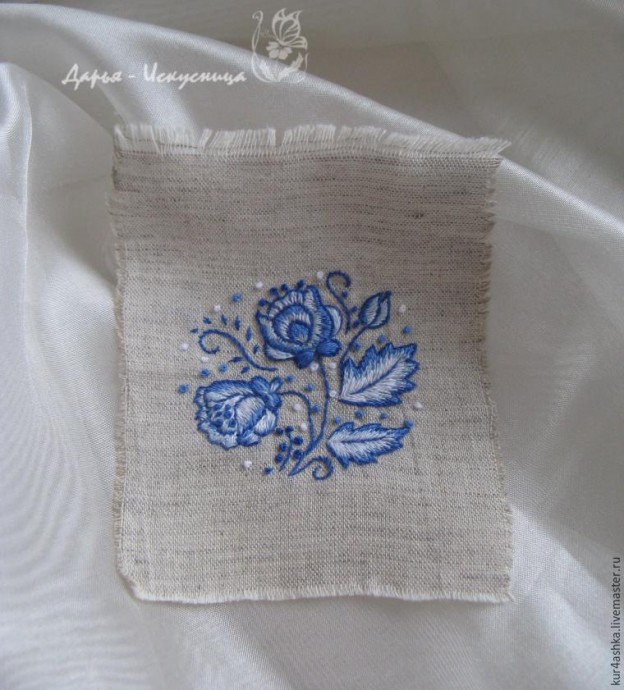 Вышиваем листики возле завитка слева вверху (по 3 стежка, соединенные снизу: длинный по центру и 2 коротких по бокам от него), внизу также добавляем листики для веточки — французские узелки. Узелками же делаем тычинки обоим цветам. Я добавила еще один завиток вверху справа и хаотично разбросала по вышивке французские узелки синего и белого цветов