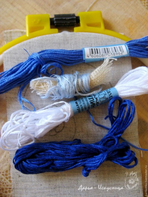 И подбираем ниточки, которыми будем вышивать, у меня это два оттенка темно-синего, голубой и белый.