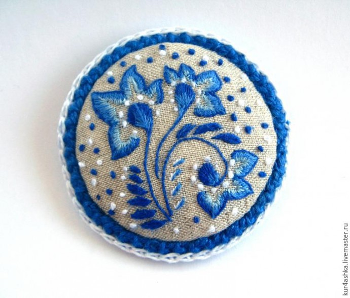 Далее подрезаем ткань по кругу, диаметр которого должен быть примерно на 1,5 см больше основы и прокладываем наметочный шов по краю вышивки. На основу кладем немного синтепона (количество зависит от желаемой «пухлости» брошки), и кладем в центр вышивки синтепоном вниз. Стягиваем наметочный шов, следя за тем, чтобы синтепон не вылазил на обратную сторону. Чтобы ткань натянулась ровно стягиваем края частыми стежками