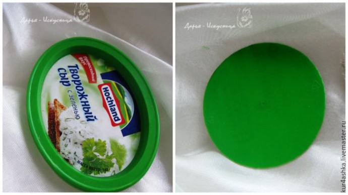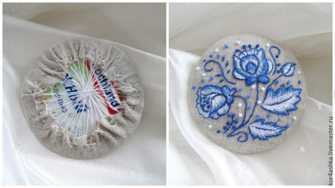 Готовим основу для броши. Я взяла для этого вот такую крышку, можно использовать плотный картон, но тогда брошь будет бояться воды. Измеряем размер вышивки с небольшим запасом (около 5 мм), циркулем рисуем на крышке круг нужного диаметра и ровненько вырезаем