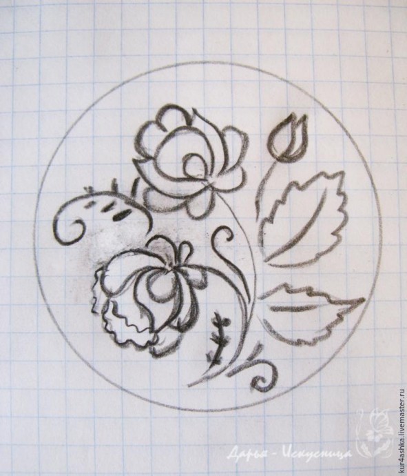 На ткани рисуем круг, определяющий границы вышивки. Я делаю это при помощи циркуля и очень мягкого карандаша (8В) Вероятно удобнее было бы работать со специальным исчезающим маркером, но как-то не обзавелась.