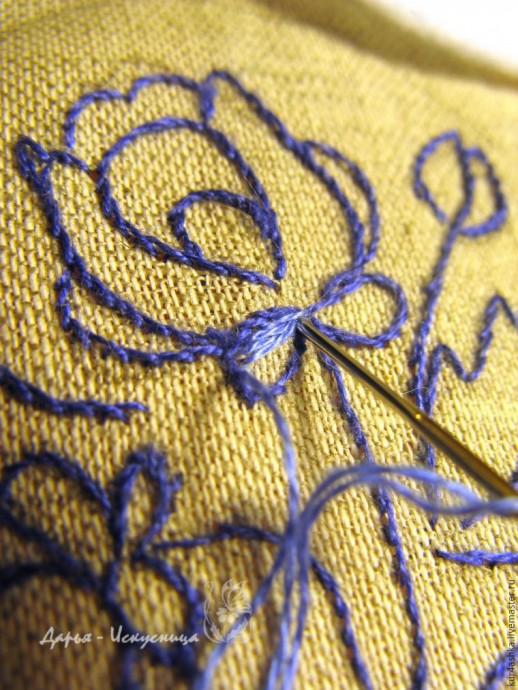 Итак, наношу первый цветок и начинаю вышивать каждую линию стебельчатым швом, как бы «рисуя» контур нитью