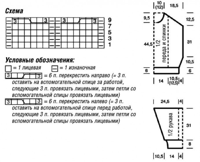 Узор 6: узор из «кос» (на 16 п.) = вязать согл. схеме. На ней даны лицевые ряды. В изнаночных рядах петли провязывать по рисунку. Постоянно повторять 1-10-й р.