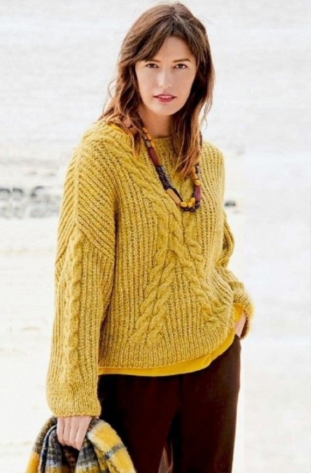 Вам потребуется: пряжа (62% хлопка, 32% шерсти беби альпака, 6% натуральной шерсти; 110 м/50 г) — 450 (500) г желтой меланжевой; спицы № 4 и 4,5; круговые спицы № 4.