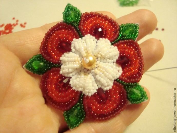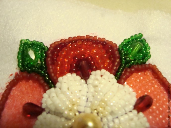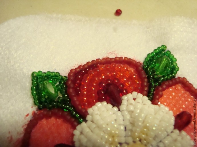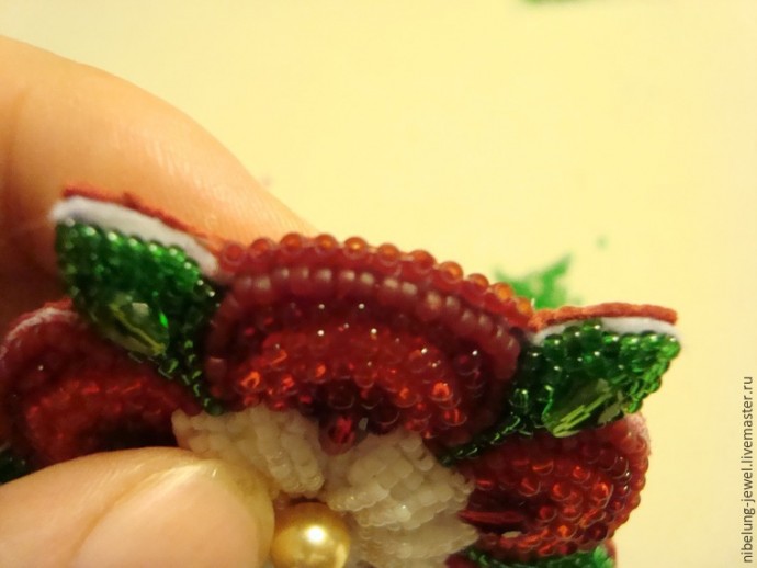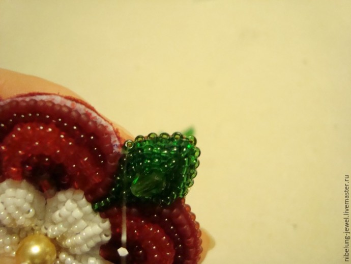 Край брошки обработать американским способом, то есть укладывая бисерины плашмя. Для обработки края используем мелкий бисер темно-красного и зеленого цвета.