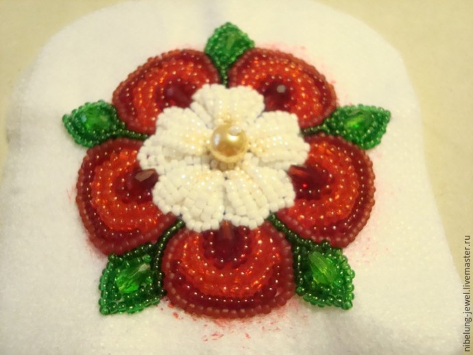 На размеченном месте, в середине лепестков, вшиваем красные бусины-капли.